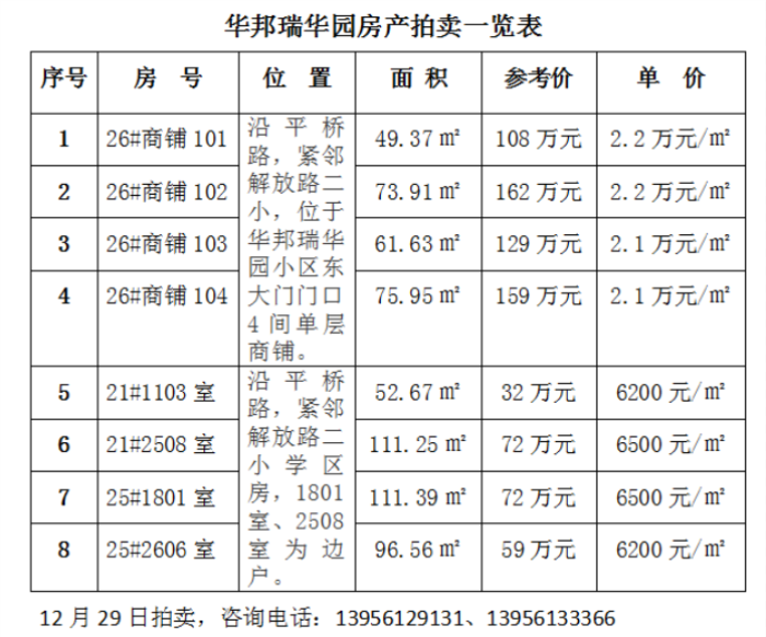 一、拍賣標(biāo)的:1、沿市區(qū)主干道平橋路,緊鄰解放路二小、華邦瑞華園小區(qū)大門口四間商鋪26#101-104,全部為單層,門前有停車場(chǎng)。其中小區(qū)門口第一間101鋪49.37㎡,2.2萬元/㎡,參考價(jià)108萬元;