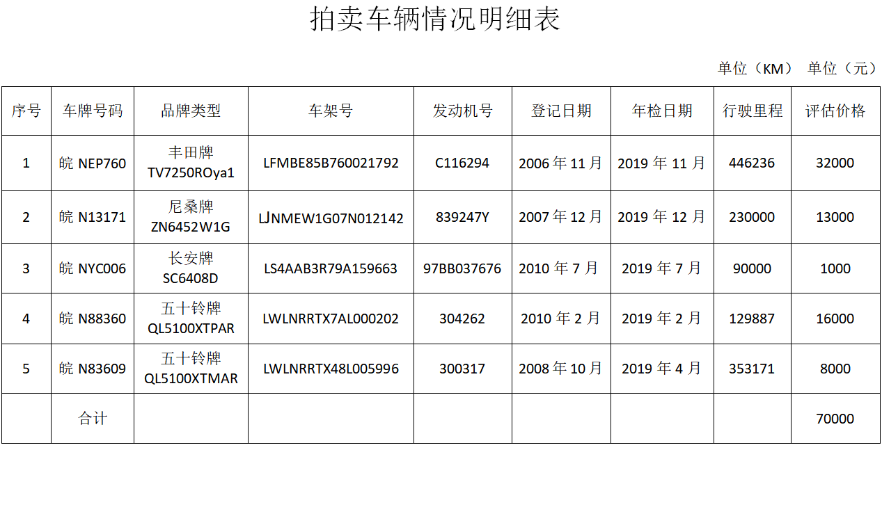 一、拍賣標(biāo)的:二手車五輛,打包拍賣,參考價(jià)7萬元。