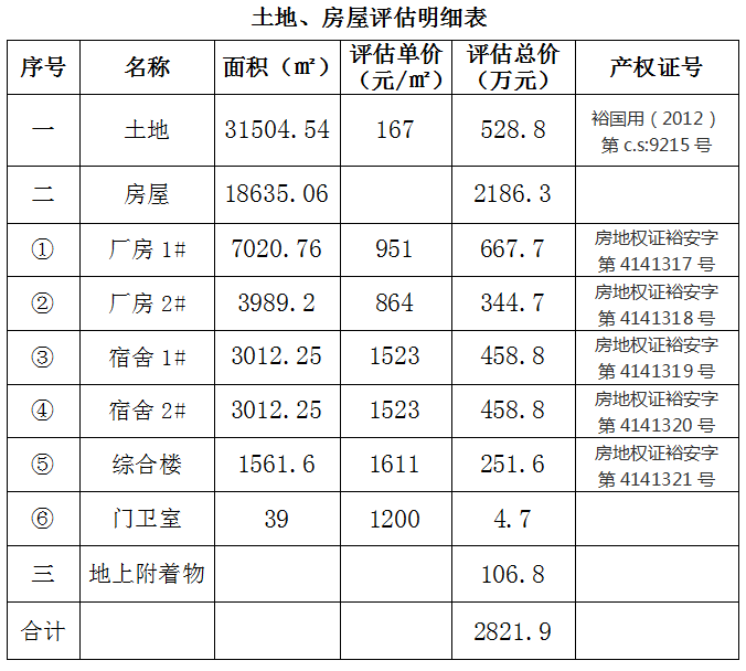 一、拍賣標(biāo)的:位于六安市城南鎮(zhèn)高新技術(shù)產(chǎn)業(yè)開發(fā)區(qū)(原裕安經(jīng)濟(jì)開發(fā)區(qū))振東大道,安徽華濤電子有限公司破產(chǎn)財(cái)產(chǎn),包括:工業(yè)用地31504.54㎡,約47.3畝,土地證號(hào):裕國用(2012)第c.s:9215號(hào);廠房、辦公樓、宿舍樓等房產(chǎn),總建筑面積18635.06㎡,其中:1#廠房建筑面積7020.76㎡;2#廠房建筑面積3989.2㎡;1#宿舍建筑面積3012.25㎡;2#宿舍建筑面積3012.25㎡;綜合樓建筑面積1561.6㎡;門衛(wèi)室建筑面積39㎡。