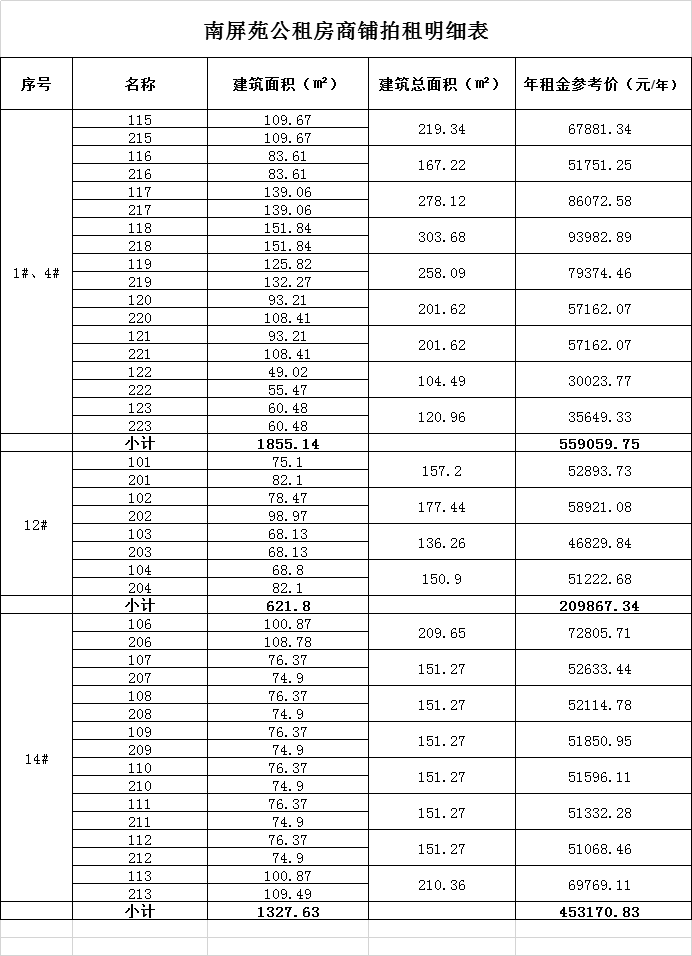 1、南屏苑公租房1#、4#樓商鋪,計(jì)18間,總建筑面積約1855.14㎡;整體拍租,參考價(jià):年租金55.91萬元;