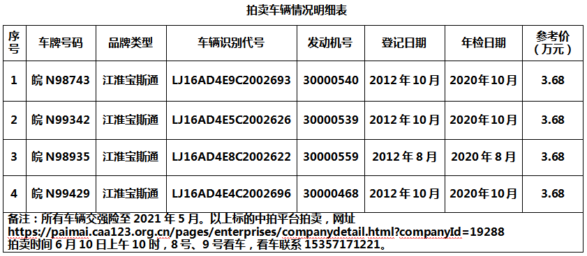 1、皖N98743江淮寶斯通,2012年10月注冊,參考價3.68萬元;