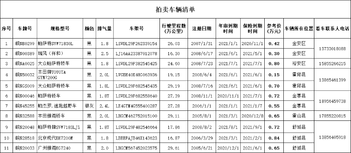 二手車11輛(車牌號為本次拍賣車輛的依據(jù),拍賣不含車輛號牌,詳見拍賣清單)。違章由車輛原單位處理,車輛以交付時的實際情況為準(zhǔn),參考價:0.15-0.84萬元/輛。車輛詳情請點(diǎn)擊下圖,可以放大。