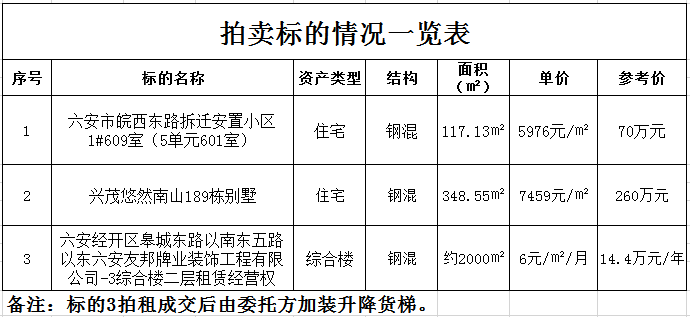 1、六安市皖西東路拆遷安置小區(qū)1#609室,建筑面積117.13㎡,5976元/平方米,參考價(jià):70萬元;