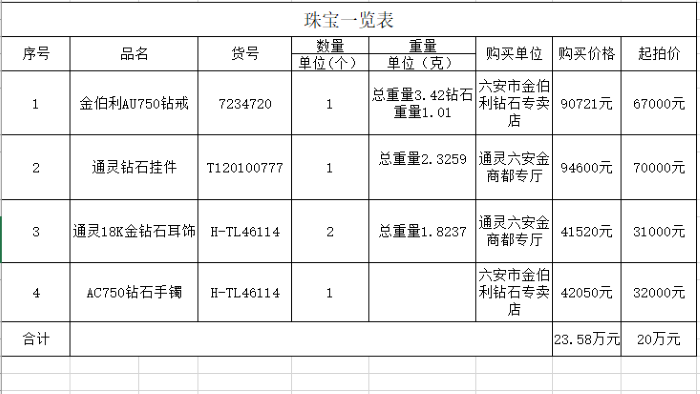 一、拍賣(mài)標(biāo)的:金伯利AU750鉆戒一個(gè)、通靈鉆石掛件一個(gè)、通靈18K金鉆石耳飾兩個(gè)(一對(duì)),AC750鉆石手鐲一個(gè)。詳情見(jiàn)下表。