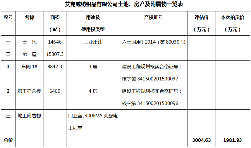 一、拍賣標(biāo)的:位于六安市金安經(jīng)濟(jì)開(kāi)發(fā)區(qū)鳳凰路與山源路交匯處六安艾克威紡織品有限公司所擁有的房產(chǎn)(約15307.3㎡)、工業(yè)土地(約14646㎡)、附屬物等,整體拍賣,參考價(jià)1981.93萬(wàn)元。包括: