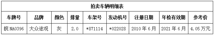 一、拍賣標(biāo)的:皖NA0396大眾途觀,注冊日期2010年6月,2.0排量,年檢有效期至2021年6月,參考價(jià)4.05萬元。