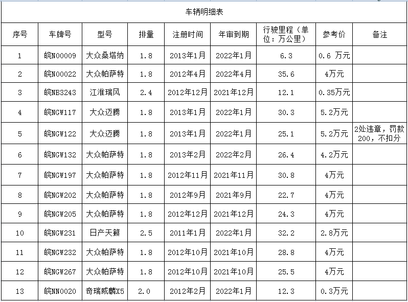 一、拍賣標(biāo)的:皖NGW202帕薩特轎車等二手車13輛。標(biāo)的詳情見清單。參考價(jià)0.3—5.2萬元/輛。
