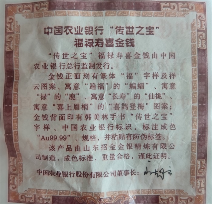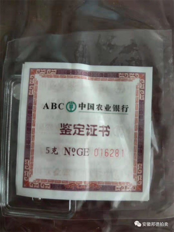 1、中國(guó)農(nóng)業(yè)銀行福祿壽喜傳世之寶金錢30枚,質(zhì)量5克/枚。優(yōu)先整體拍賣,整體無(wú)人競(jìng)買,再分拆為每枚為一個(gè)標(biāo)的。參考價(jià):1836元/枚。競(jìng)買保證金整體為1萬(wàn)元,每枚保證金1000元。標(biāo)注成色“Au99.99”。