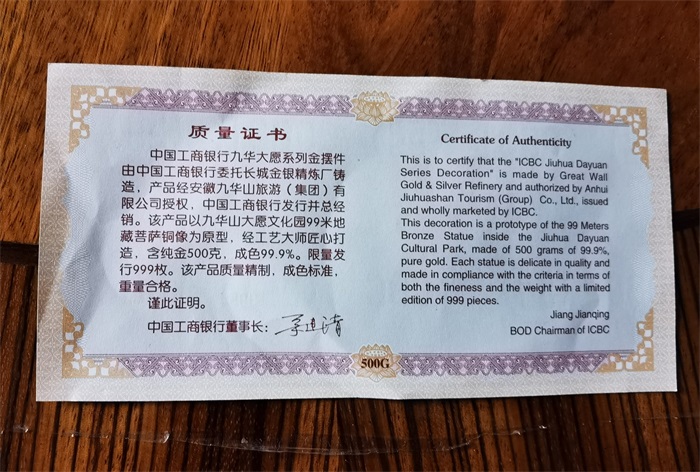 3、限量版中國(guó)工商銀行九華大愿系列金佛一座,質(zhì)量2880.83克(含純金500克)。該佛像由中國(guó)工商銀行委托長(zhǎng)城金銀精煉廠鑄造,經(jīng)安徽九華山旅游集團(tuán)公司授權(quán),限量發(fā)行999枚,該產(chǎn)品以九華山大愿文化園99米地藏菩薩像為原型,經(jīng)工藝大師匠心打造,含純金500克,參考價(jià)18.36萬(wàn)元。競(jìng)買保證金2萬(wàn)元。