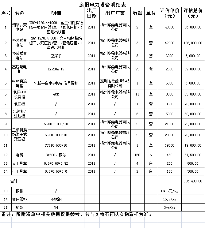 1、三相樹(shù)脂絕緣干式變壓器、預(yù)裝式變電站、高壓配電柜等一批廢舊電力設(shè)備。標(biāo)的詳情見(jiàn)所附清單。參考價(jià):58.64萬(wàn)。