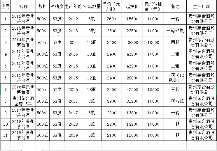 1、貴州茅臺酒119瓶,具體詳見下方清單: