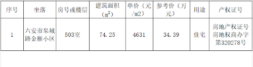 標(biāo)的1:六安市皋城路與梅山北路交叉口煙草巷金雁小區(qū)503室住宅房,建筑面積74.25㎡,4631元/㎡,起拍價(jià):34.39萬元。