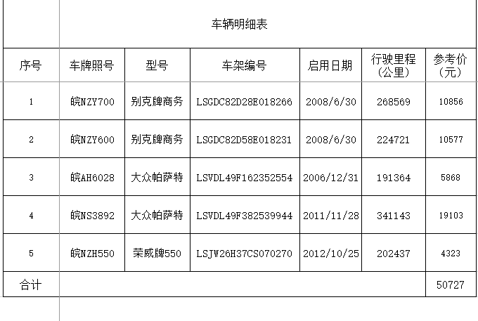一、拍賣標(biāo)的:皖NZY700別克商務(wù)、皖NZY600別克商務(wù)、皖A(yù)H6028大眾帕薩特、皖NS3892帕薩特、皖NZH550榮威等5輛二手車,整體打包拍賣,參考價(jià):50727元。保證金:1萬(wàn)元。