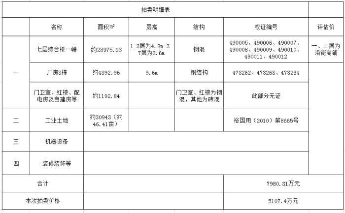 一、拍賣標(biāo)的:位于六安市裕安區(qū)城南鎮(zhèn)、沿105國道、省級高新區(qū)六安高新技術(shù)產(chǎn)業(yè)開發(fā)區(qū),六安市鴻源機(jī)械有限責(zé)任公司所擁有的房屋建筑物及附屬、土地、機(jī)器設(shè)備、裝飾裝修等,包括:1、沿105國道七層綜合樓一幢,面積約28975.93㎡,1-2層層高約4.8m ,3-7層層高約3.6m,沿105國道及其他一樓現(xiàn)作沿街門面用,二樓及以上可作服裝廠用;單層鋼構(gòu)廠房三幢,面積約4392.96㎡,層高約9.6m。以上綜合樓及廠房均有證;門衛(wèi)室、配電房及自建房等,面積約1192.84㎡,此部分無證。2、工業(yè)出讓土地30943㎡,約46.41畝,土地使用權(quán)證號:裕國用(2010)第8665號;3、機(jī)器設(shè)備;4、裝飾裝修等。