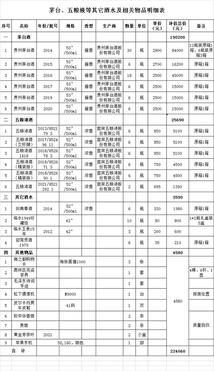 根據(jù)貴州茅臺酒股份有限公司黔茅辨(鑒)第0019083號產(chǎn)品辨認(鑒定)表,上拍茅臺酒計72瓶;根據(jù)四川宜賓五糧液集團有限公司川五鑒第號鑒定證明書,上拍五糧液計32瓶。其他類酒水25瓶,其他類物品一批。整體打包拍賣,參考價:224060元,保證金:3萬元。具體詳見下方清單: