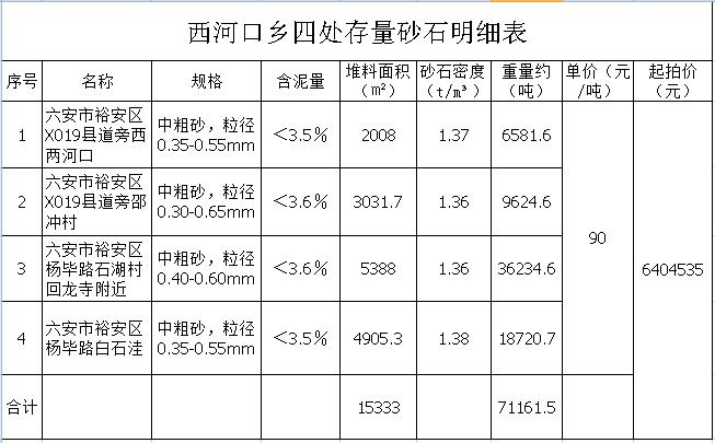 六安市西河口鄉(xiāng)四處存量砂石,分別位于河口村(中心公里網(wǎng)坐標(biāo)X:3492300,Y:433100)、邵沖村(中心公里網(wǎng)坐標(biāo)X:3490500,Y:432900)、石湖村回龍寺附近(中心公里網(wǎng)坐標(biāo)X:3483500,Y:437200)、石湖村白石洼附近(中心公里網(wǎng)坐標(biāo)X:3482800,Y:436800),總重量約71161.5噸,單價90元/噸。