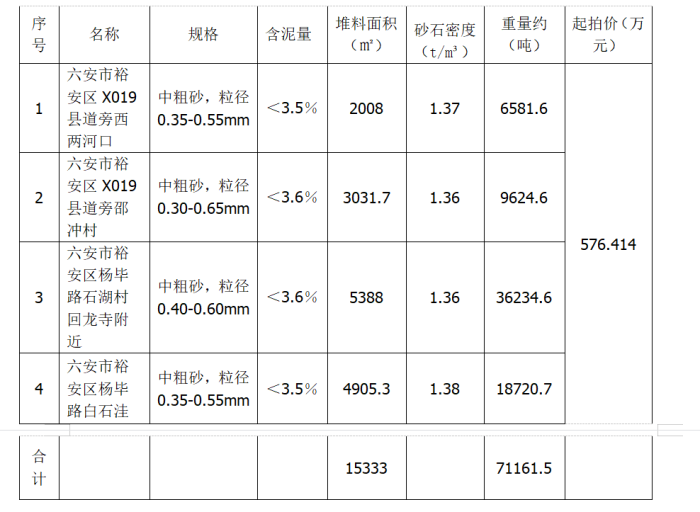 四處存量砂石整體打包拍賣,整體參考價576.414萬元。本次拍賣成交后不過磅。詳情見下方清單(清單中相關(guān)數(shù)據(jù)僅供參考,以實際看樣為準(zhǔn),以現(xiàn)場實物移交),拍賣標(biāo)的品質(zhì)、數(shù)量等數(shù)據(jù)僅供參考,如與實際有出入,不改變成交結(jié)果,不改變標(biāo)的成交價款。