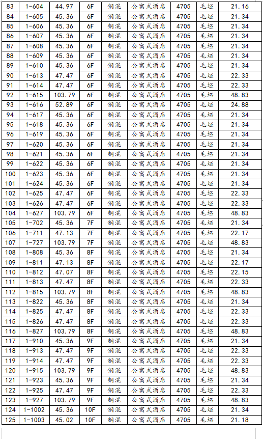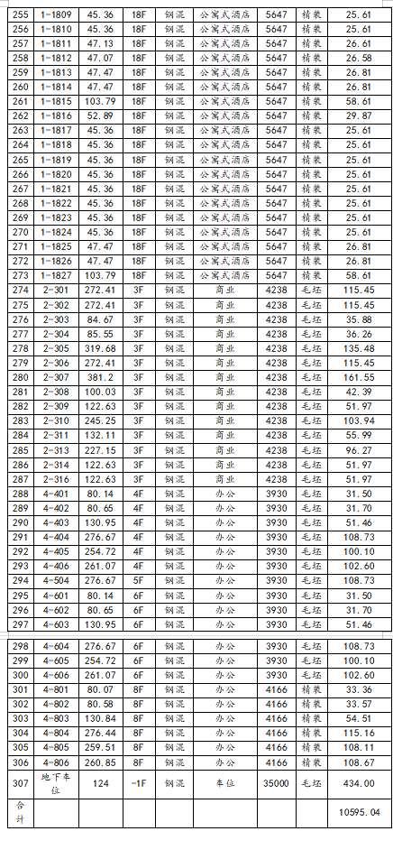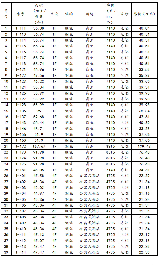 一、拍賣(mài)標(biāo)的:位于六安市金寨縣梅山鎮(zhèn)新城區(qū)紅石谷路以南、江天路以北金寨智慧萬(wàn)匯廣場(chǎng)1、2、3、4號(hào)樓的部分房屋及地下車(chē)位。其中1號(hào)樓為商業(yè)用房和公寓式酒店,2號(hào)樓為商業(yè)用房,4號(hào)樓為辦公用房,房屋總計(jì)306套,地下車(chē)位124個(gè)。具體每套房屋所在樓棟、房號(hào)、面積、樓層、房屋用途、單價(jià)及每套房產(chǎn)價(jià)格詳見(jiàn)以下拍品清單: