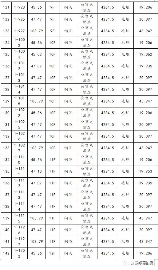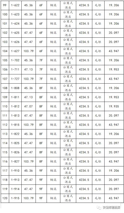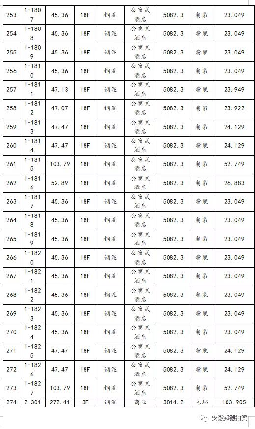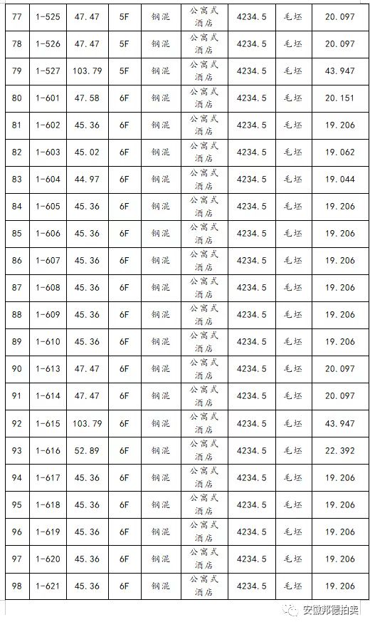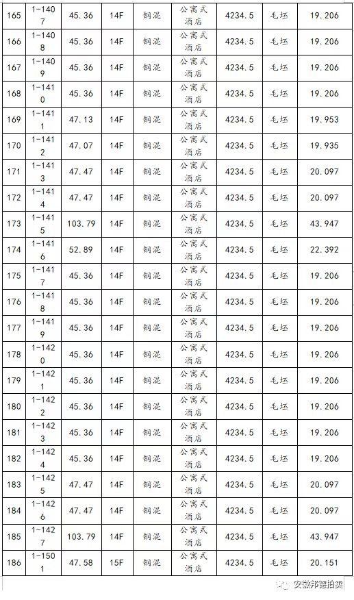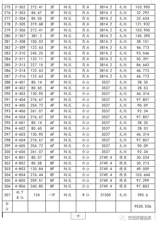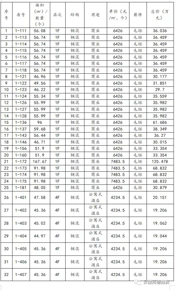 一、拍賣標(biāo)的:位于六安市金寨縣梅山鎮(zhèn)新城區(qū)紅石谷路以南、江天路以北金寨智慧萬(wàn)匯廣場(chǎng)1、2、3、4號(hào)樓的部分房屋及地下車位。其中1號(hào)樓為商業(yè)用房和公寓式酒店,2號(hào)樓為商業(yè)用房,4號(hào)樓為辦公用房,房屋總計(jì)306套,地下車位124個(gè)。具體每套房屋所在樓棟、房號(hào)、面積、樓層、房屋用途、單價(jià)及每套價(jià)格詳見(jiàn)以下標(biāo)的物清單: