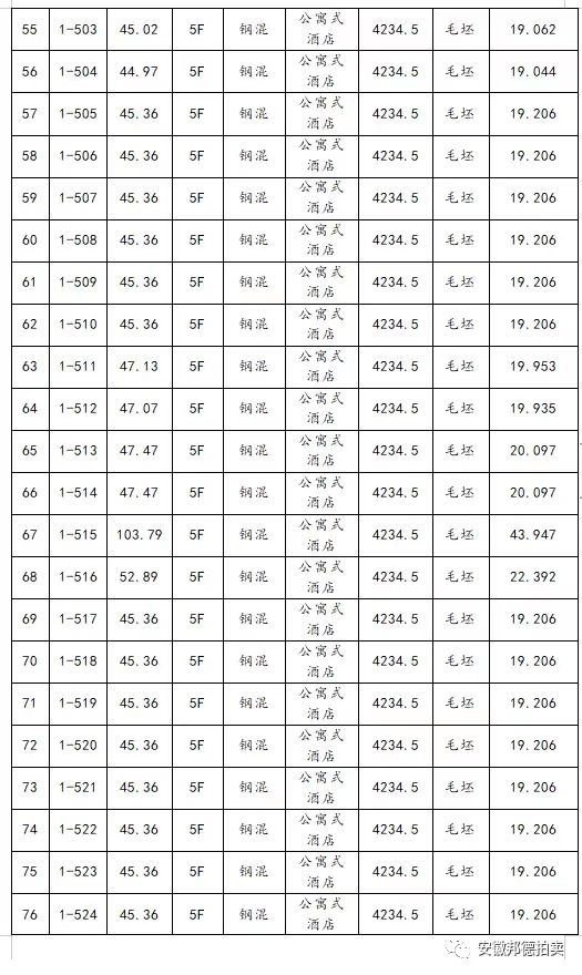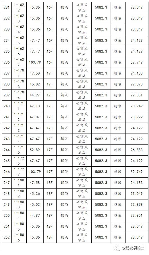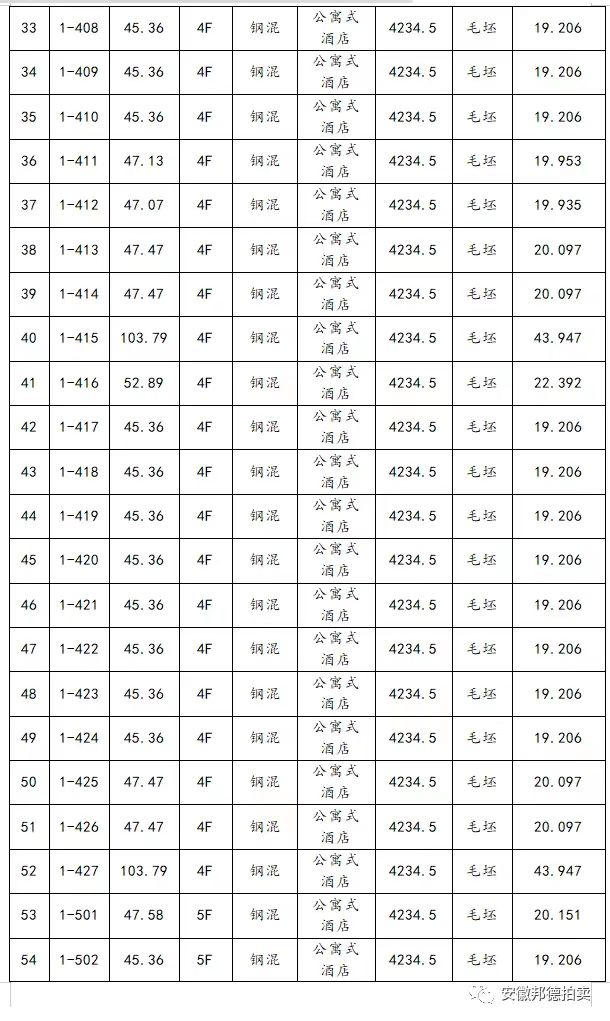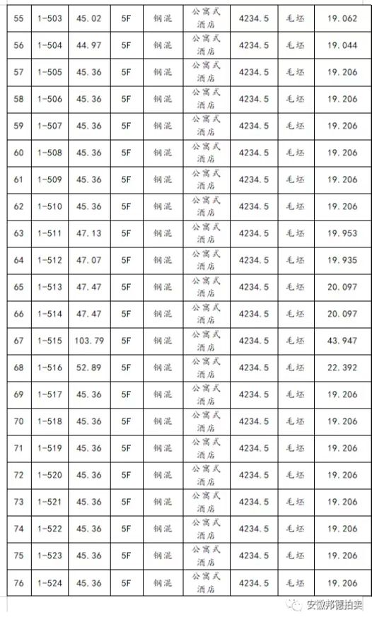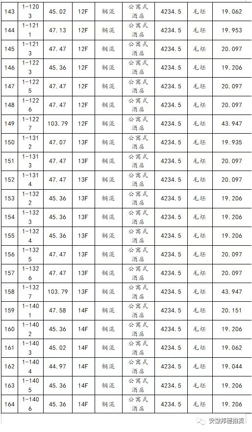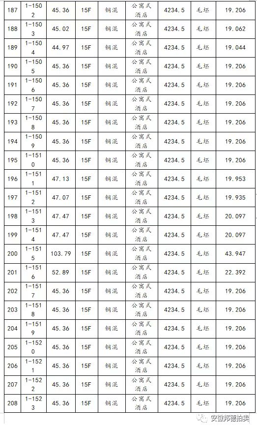 一、拍賣標(biāo)的:位于六安市金寨縣梅山鎮(zhèn)新城區(qū)紅石谷路以南、江天路以北金寨智慧萬(wàn)匯廣場(chǎng)1、2、3、4號(hào)樓的部分房屋及地下車位。其中1號(hào)樓為商業(yè)用房和公寓式酒店,2號(hào)樓為商業(yè)用房,4號(hào)樓為辦公用房,房屋總計(jì)306套,地下車位124個(gè)。具體每套房屋所在樓棟、房號(hào)、面積、樓層、房屋用途、單價(jià)及每套價(jià)格詳見(jiàn)以下標(biāo)的物清單: