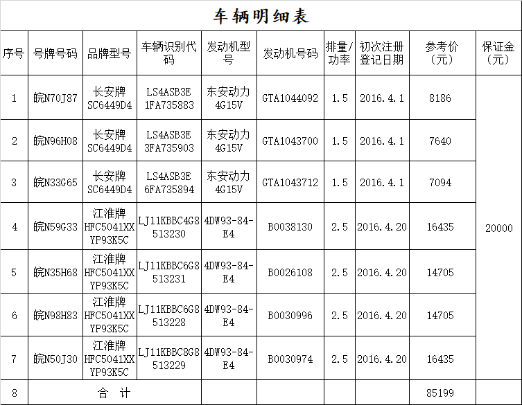 一、拍賣標(biāo)的:皖N70J87等二手車7輛,整體打包拍賣,參考價(jià):8.5199萬(wàn)元,保證金:2萬(wàn)元。車輛詳情見下方清單: