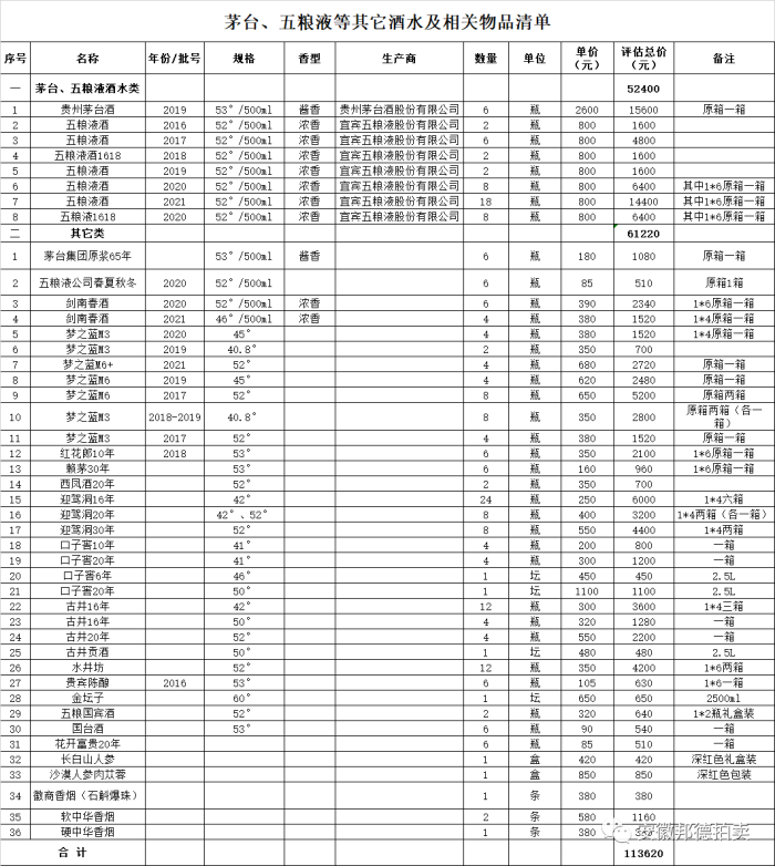 一、拍賣(mài)標(biāo)的:罰沒(méi)茅臺(tái)酒計(jì)6瓶;五糧液酒計(jì)46瓶及其他酒水、物品一批。參考價(jià):9.1萬(wàn)元,競(jìng)買(mǎi)保證金:2萬(wàn)元。具體詳見(jiàn)下方清單: