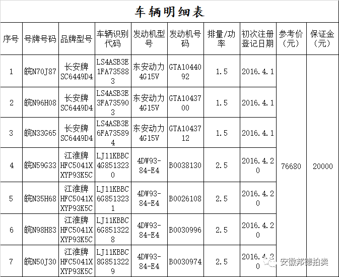 一、拍賣標的:皖N70J87等二手車7輛,整體打包拍賣,參考價:7.668萬元,保證金:2萬元。車輛詳情見下方清單: