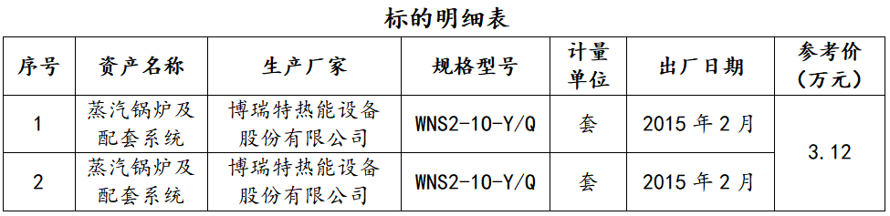 一、拍賣標的:廢舊蒸汽鍋爐及配套系統(tǒng)2套,整體打包拍賣,參考價:3.12萬元,競買保證金:2萬元。