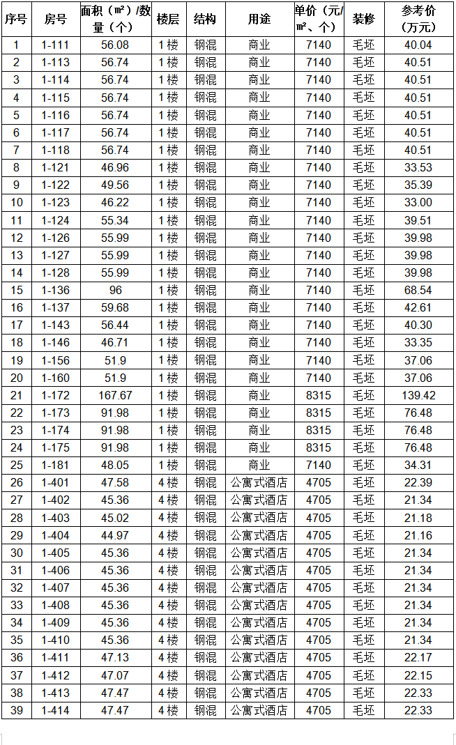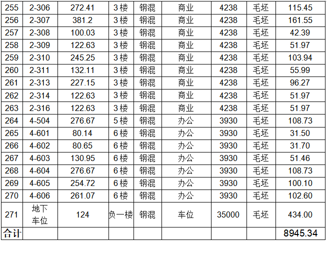 一、拍賣標的:位于六安市金寨縣梅山鎮(zhèn)新城區(qū)紅石谷路以南、江天路以北,金寨智慧萬匯廣場1、2、3、4號樓270套房屋及124個地下車位,整體打包拍賣。參考價:8945.34萬元。保證金:900萬元。標的詳情詳見以下標的物清單: