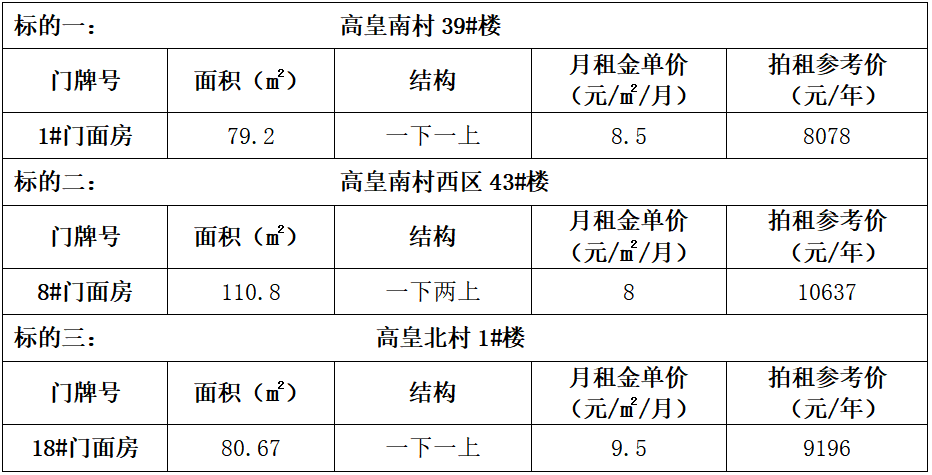一、拍租標(biāo)的:六安市裕安區(qū)平橋工業(yè)園高皇南、北村安置小區(qū)門面房3年期租賃經(jīng)營權(quán),詳情見下表