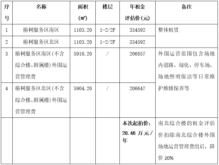 一、拍租標(biāo)的:六安市金安區(qū)省道S329椿樹服務(wù)區(qū)(南區(qū)、北區(qū))兩處綜合樓租賃經(jīng)營(yíng)權(quán)及綜合樓外圍運(yùn)營(yíng)管理(不含加油站及住宿樓)5年期租賃經(jīng)營(yíng)權(quán),總參考價(jià)20.46萬(wàn)元/年。南北綜合樓面積約2206.4㎡。