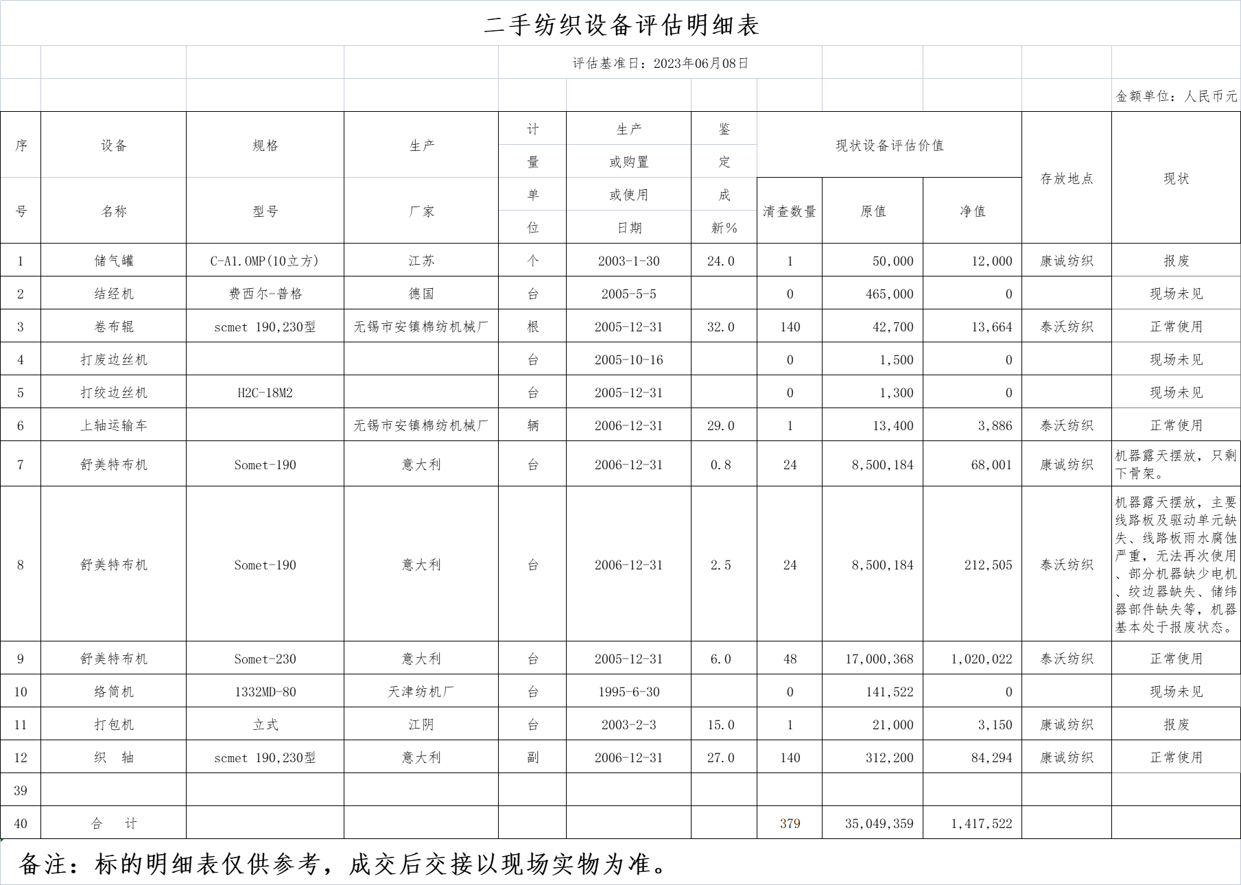 一、拍賣標的:舒美特布機、儲氣罐、織軸、上軸運輸車、卷布輥等二手紡織設(shè)備一批。