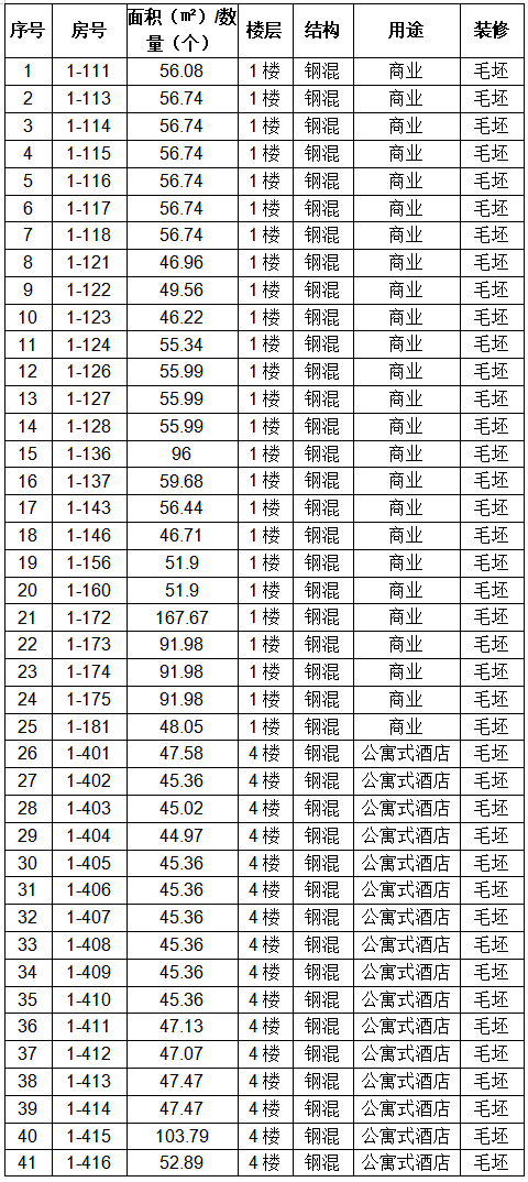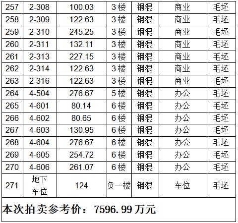 一、拍賣標(biāo)的:位于六安市金寨縣梅山鎮(zhèn)新城區(qū)紅石谷路以南、江天路以北,金寨智慧萬匯廣場1、2、3、4號樓304套房屋及124個地下車位,整體打包拍賣。參考價:7596.99萬元。保證金:700萬元。標(biāo)的詳情詳見以下標(biāo)的物清單: