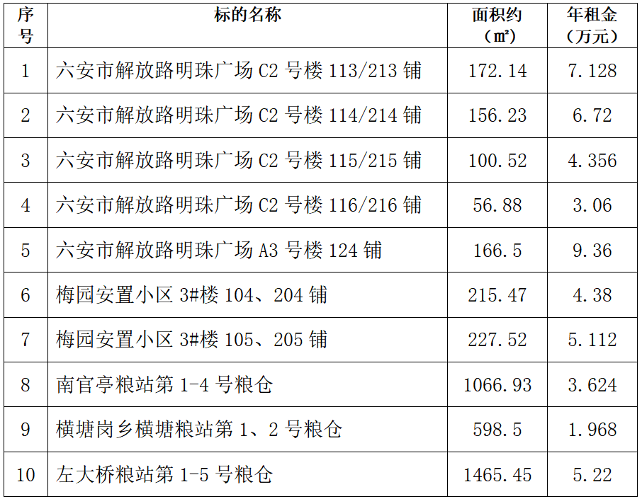 一、拍租標的:明珠廣場、梅園小區(qū)商鋪及糧站倉庫3年期租賃經(jīng)營權(quán),標的詳情見下表: