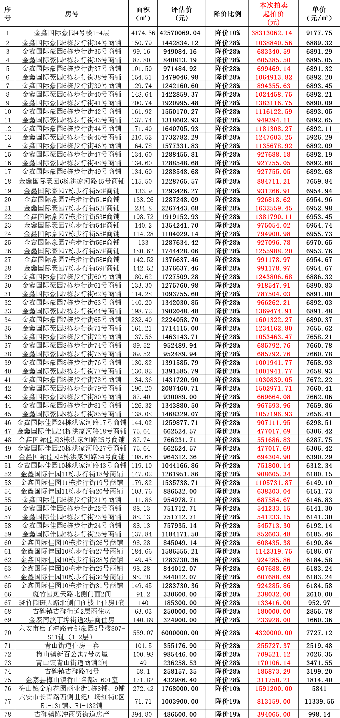 2、金寨金鑫國(guó)際豪園、國(guó)際佳園小區(qū)商鋪,64間,按間拍賣,建筑面積75㎡-230㎡/間,47-163萬(wàn)元/間。具體每間面積、價(jià)格詳見(jiàn)所附清單。
