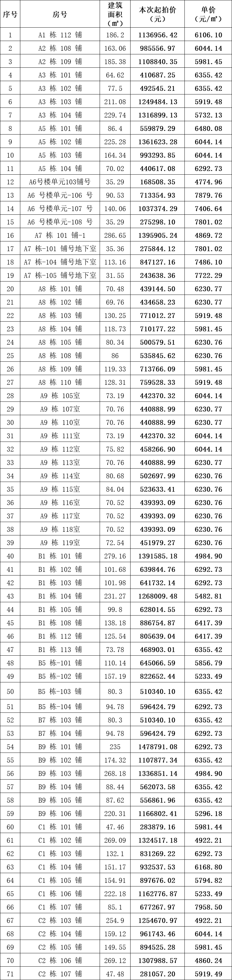 一、拍賣(mài)標(biāo)的:金寨縣金江新城沿河商鋪71間,按間拍賣(mài),建筑面積約31.55㎡-286.65㎡/間,起拍價(jià):16.851-147.8791萬(wàn)元/間。具體每間面積、價(jià)格詳見(jiàn)下方所附明細(xì)表。