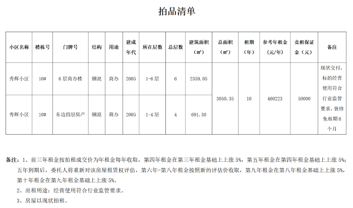 六安市秀輝小區(qū)10#6層商辦樓及東邊四層房產(chǎn)十年期租賃權(quán),建筑面積約3050.35㎡,整體拍租,租金年付。年租金參考價:460223元,10年期總參考價:4602230元。保證金:50000元。拍租標(biāo)的詳情請查看下方拍品清單: