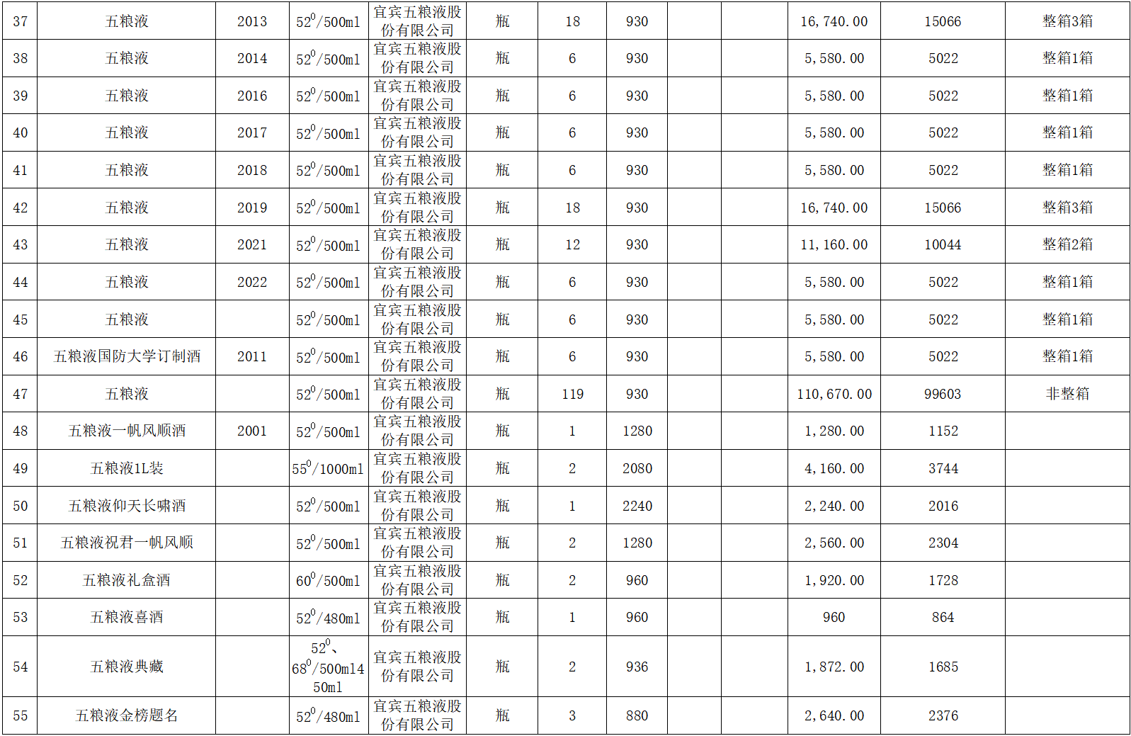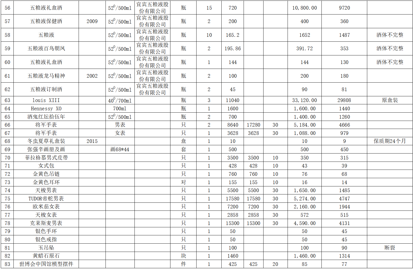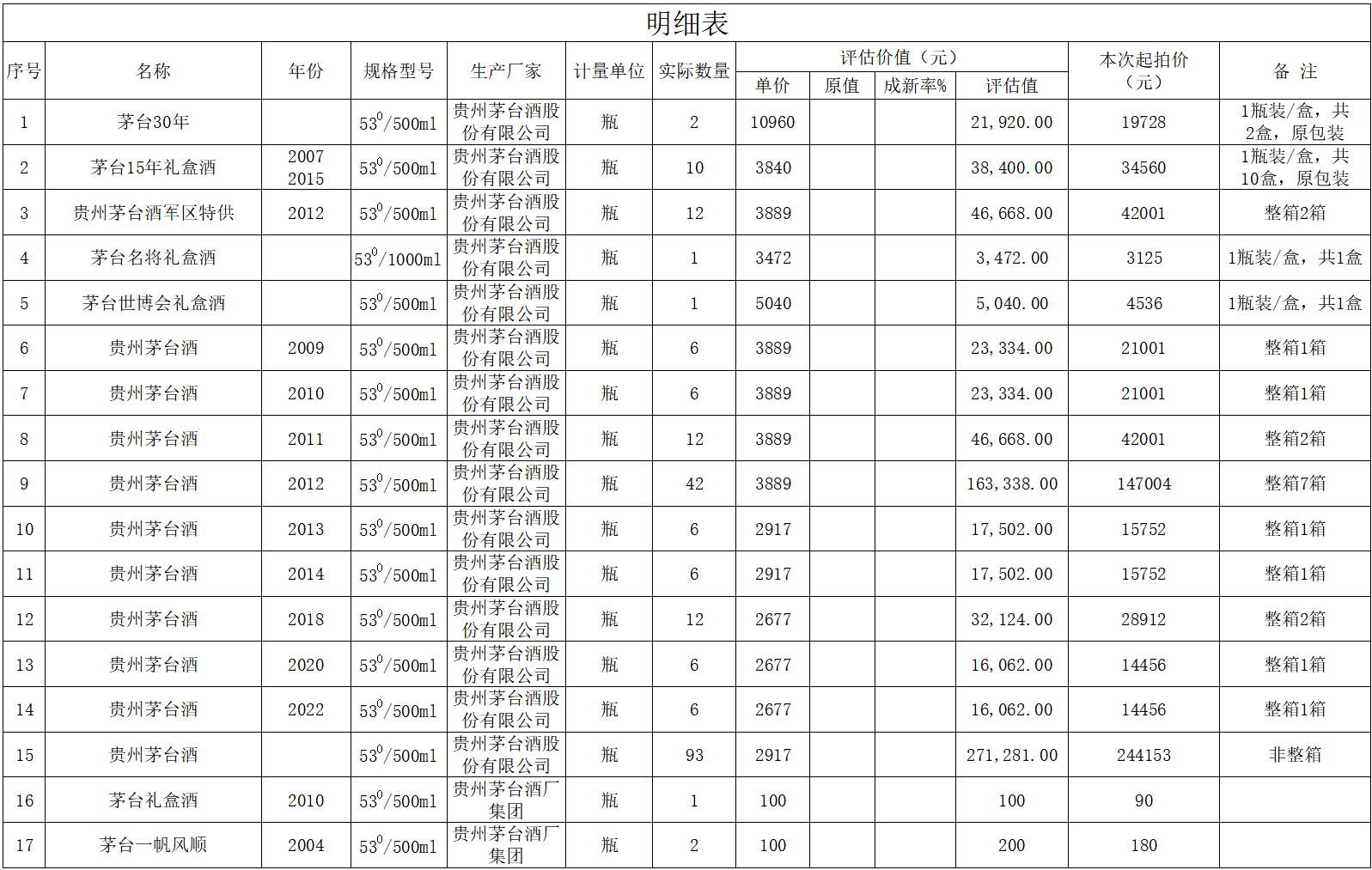 一、拍賣(mài)標(biāo)的:貴州茅臺(tái)酒計(jì)224瓶、五糧液酒計(jì)406瓶及其他酒水、物品一批,整體打包拍賣(mài),參考價(jià):106.047萬(wàn)元。競(jìng)買(mǎi)保證金:10萬(wàn)元。詳見(jiàn)下方明細(xì)表: