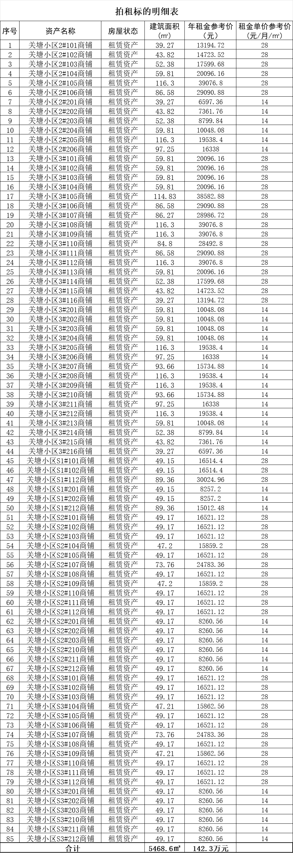 一、拍租標(biāo)的:六安市關(guān)塘小區(qū)2#、3#、S1#、S2#、S3#樓共85間商鋪5年期租賃經(jīng)營(yíng)權(quán),詳見(jiàn)下方標(biāo)的明細(xì)表,總建筑面積約5468.6㎡,整體拍租,參考價(jià):142.3萬(wàn)元/年。保證金:10萬(wàn)元。