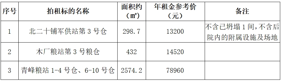 一、拍租標(biāo)的:六安市北二十鋪軍供站、木廠糧站、青峰糧站部分糧倉3年期租賃經(jīng)營權(quán),標(biāo)的詳情見下表: