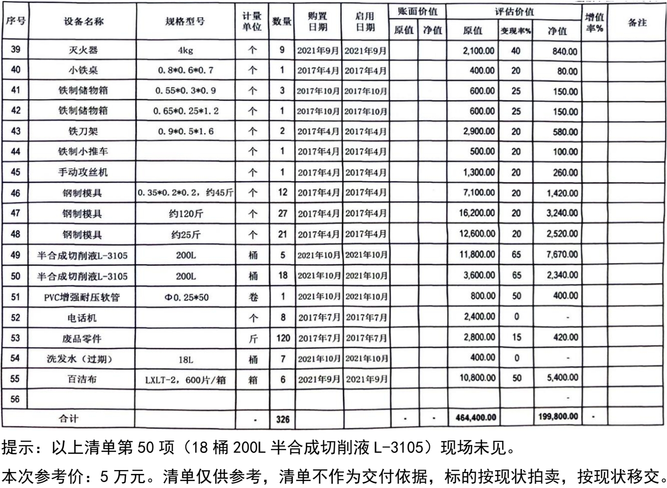 特別提示:由于標(biāo)的是廢舊物品,可能存在部件損失、不全以及規(guī)格型號不匹配等情況,現(xiàn)場數(shù)量與清單可能有差異,清單不作為交付依據(jù),以實物看樣為準(zhǔn),以現(xiàn)場實物移交。