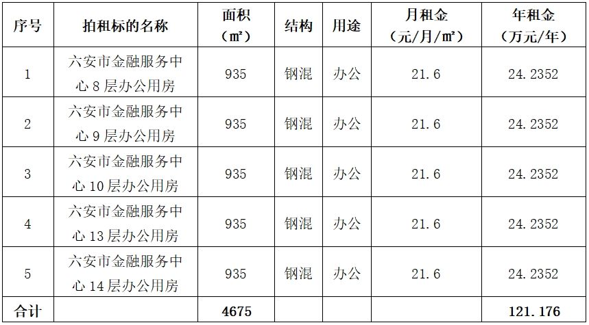 一、拍租標(biāo)的:六安市金融服務(wù)中心8-10層、13-14層已裝修辦公用房3年期租賃權(quán),拍租標(biāo)的位于六安市金裕大道與燕山路交叉口東北角,可單層出租,也可多層出租。每層租金參考價(jià):24.2352萬(wàn)元/年,合同期內(nèi)年租金無(wú)遞增。標(biāo)的詳情見(jiàn)下方標(biāo)的明細(xì)表: