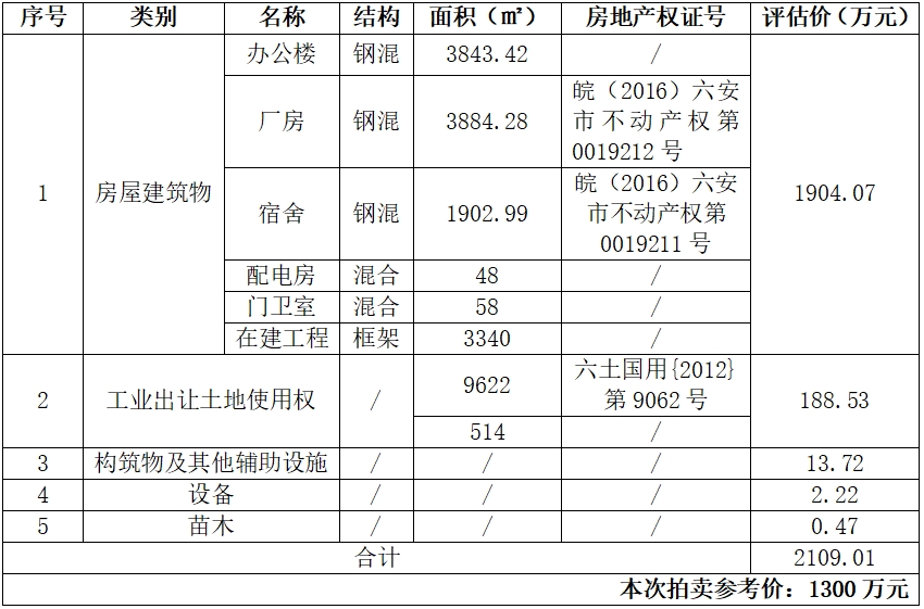 1.原六安市華宏印花有限公司所有的辦公樓、廠房、宿舍等房產(chǎn),總面積約13076.69㎡。其中宿舍樓和廠房有產(chǎn)權(quán)證。