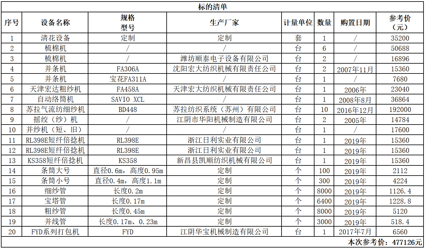 一、拍賣標的:二手紡織設備一批,包括清花設備、自動絡筒機、梳棉機、并條機、粗紗機、細紗機等。以上標的整體拍賣,參考價:47.7126萬元,F(xiàn)狀拍賣,現(xiàn)狀移交。競買保證金:10萬元。