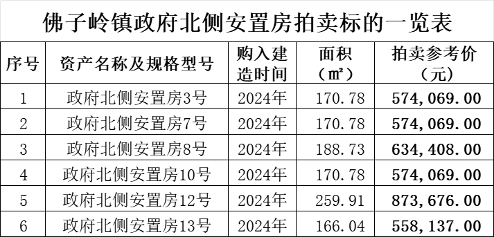 3、2025年1月24日16時(shí)拍賣:佛子嶺鎮(zhèn)政府北側(cè)安置房6套,總建筑面積約1127平方米,土地性質(zhì)為國(guó)有劃撥土地,本次拍賣不含土地。(詳情及拍賣參考價(jià)等見下方附表↓)