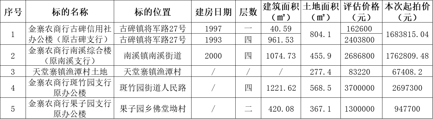 金寨農(nóng)商行閑置房地產(chǎn):古碑信用社辦公樓(原古碑支行)、南溪綜合樓(原南溪支行)、天堂寨鎮(zhèn)漁潭村土地、斑竹園支行原辦公樓、果子園支行原辦公樓等五處資產(chǎn),F(xiàn)狀拍賣,現(xiàn)狀移交。標(biāo)的詳情見下方所附清單: