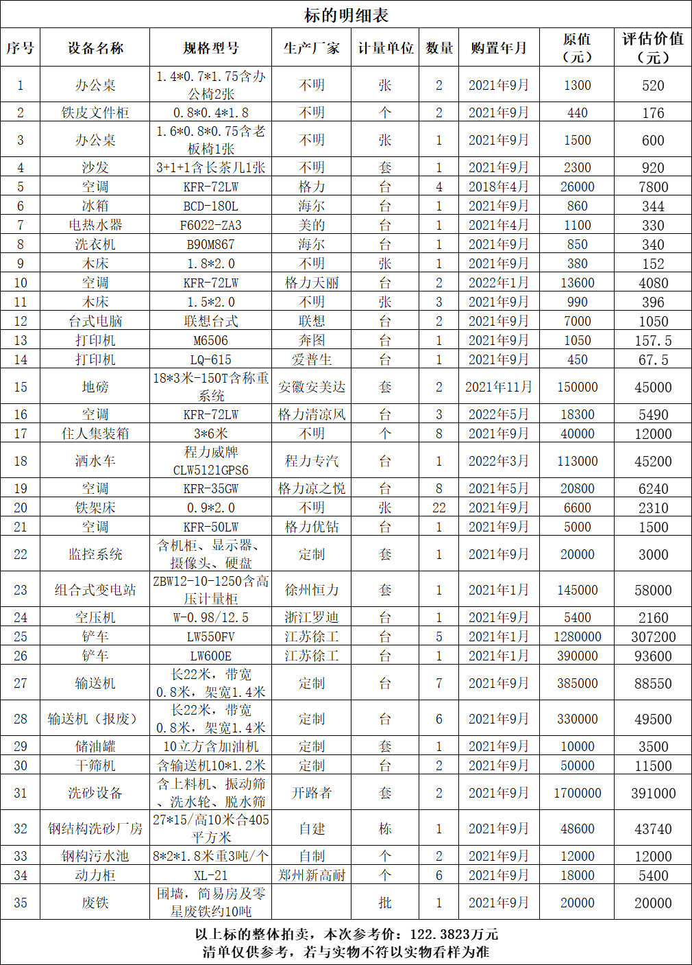 標的詳情見下方所附清單(清單僅供參考,若與實物不符以實物看樣為準)。