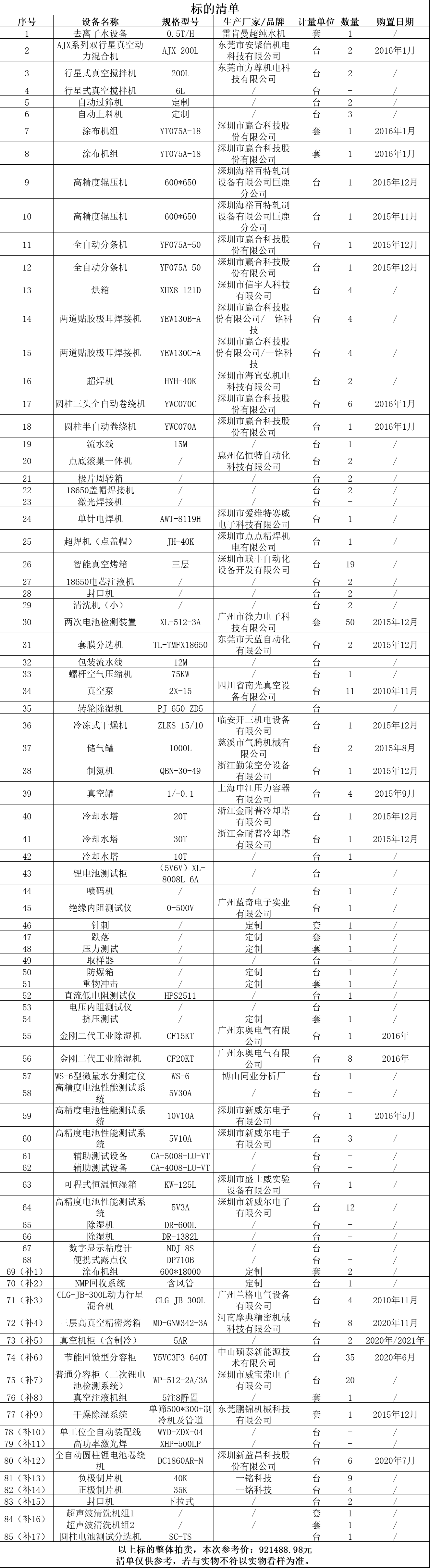 一、拍賣標(biāo)的:全自動(dòng)圓柱鋰電池卷繞機(jī)、正負(fù)制片機(jī)、AJX系列雙行星真空動(dòng)力混合機(jī)、圓柱三頭全自動(dòng)卷繞機(jī)、行星式真空攪拌機(jī)、涂布機(jī)組等二手設(shè)備一批,整體拍賣,參考價(jià):921488.98元。競(jìng)買保證金:10萬(wàn)元。