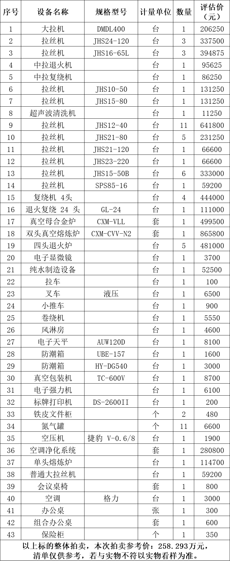 一、拍賣標(biāo)的:雙頭真空熔煉爐、真空母合金爐、空調(diào)凈化系統(tǒng)、拉絲機(jī)、復(fù)繞機(jī)4頭、大拉機(jī)、單頭熔煉爐等二手設(shè)備一批,整體拍賣,參考價(jià):258.293萬元。競買保證金:20萬元。