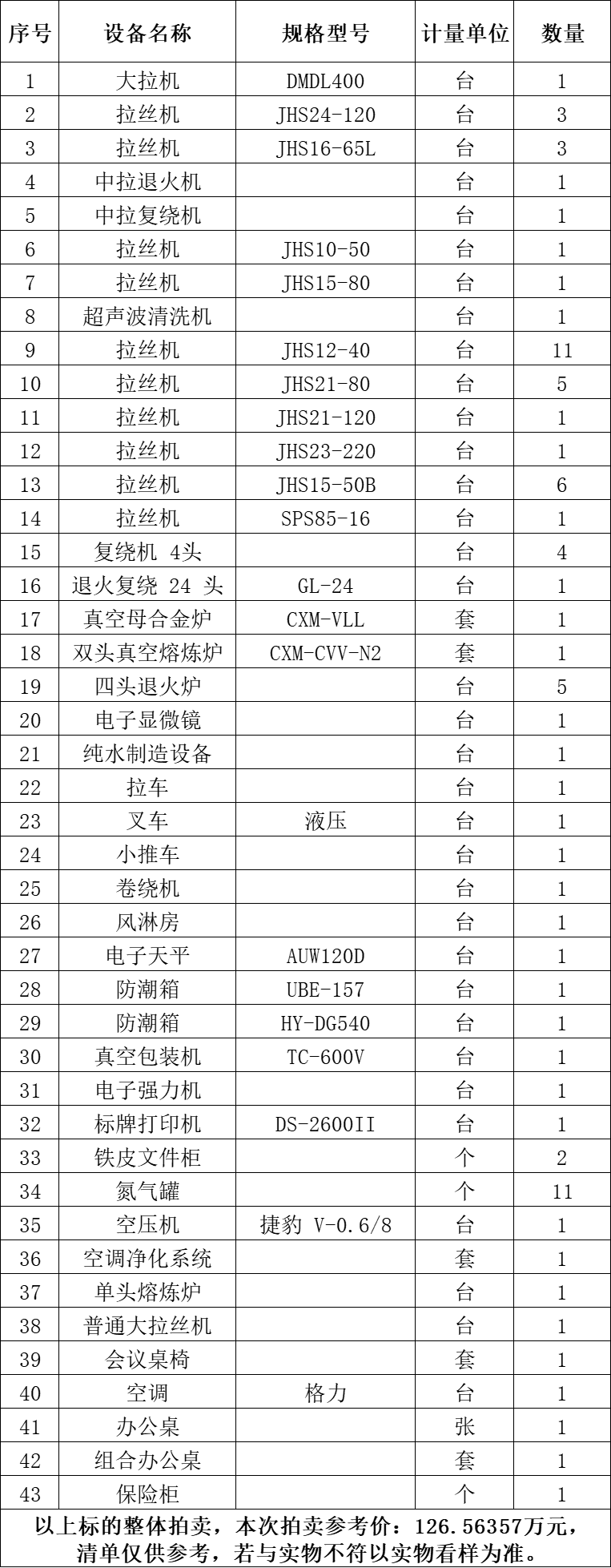 一、拍賣標(biāo)的:雙頭真空熔煉爐、真空母合金爐、空調(diào)凈化系統(tǒng)、拉絲機、復(fù)繞機4頭、大拉機、單頭熔煉爐等二手設(shè)備一批,整體拍賣,參考價:126.56357萬元。競買保證金:15萬元。